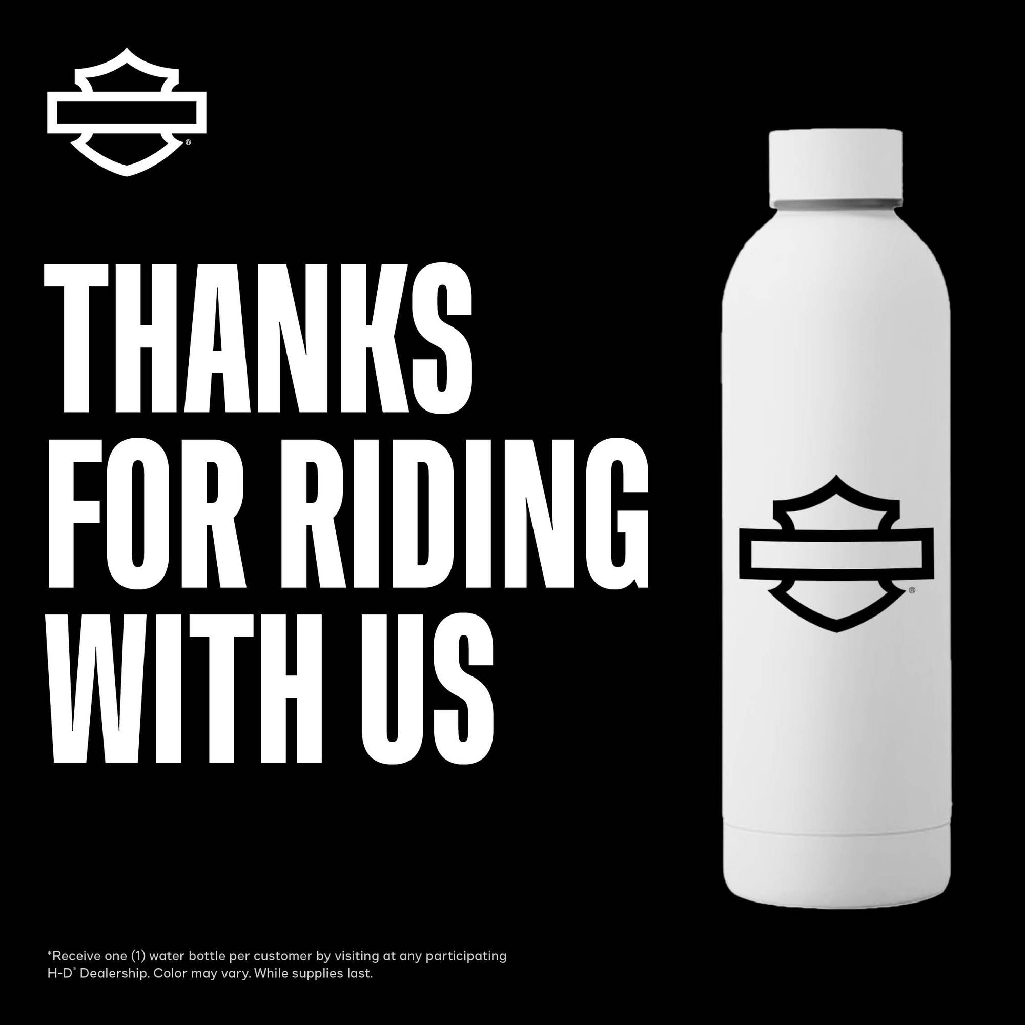 * The water bottle offer is valid only for select test rider and is non transferable. Select test rider must visit the participating Harley-Davidson dealership where test ride was conducted. Limited to one (1) water bottle per select test rider. Color may vary. Quantities limited; while supplies last. Cannot be redeemed for cash or cash equivalent. Cannot be combined with any other offer, discount or promotion. Offer is subject to change without notice. Void where prohibited or restricted by law. ©2025 H-D or its affiliates. H-D, Harley, Harley-Davidson and the Bar & Shield Logo are among the trademarks of Harley-Davidson Motor Company.
